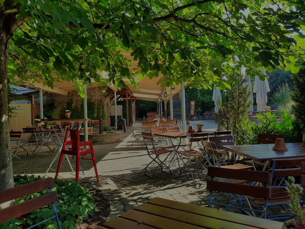 In unserem sonnigen, teilüberdachten Biergarten können Sie unsere Speisen & Getränke genießen.